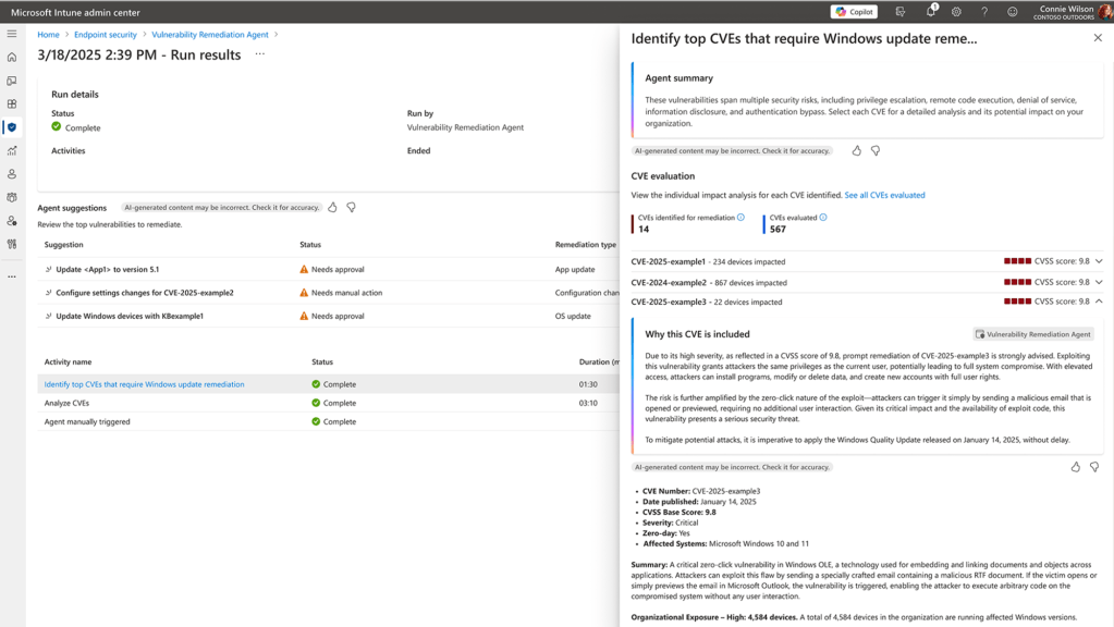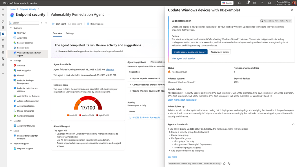 Lié à Microsoft Intune, il utilise Microsoft Defender Vulnerability Management pour identifier, évaluer et prioriser les vulnérabilités dans le contexte de l’entreprise. Il fournit aussi les tâches afin d’effectuer les changements.