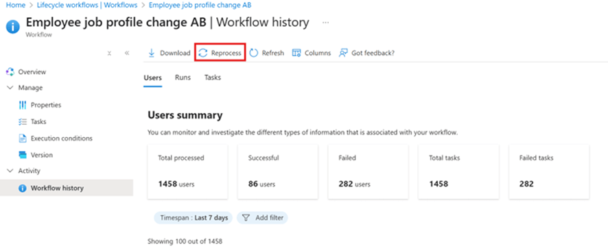 Plus d’informations : Reprocess workflow runs using Lifecycle Workflows