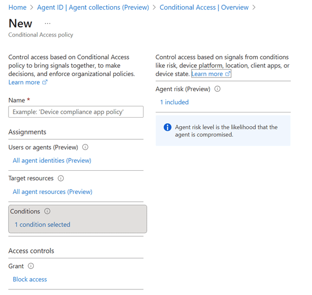 Plus d’informations : Conditional Access for Agent Identities in Microsoft Entra