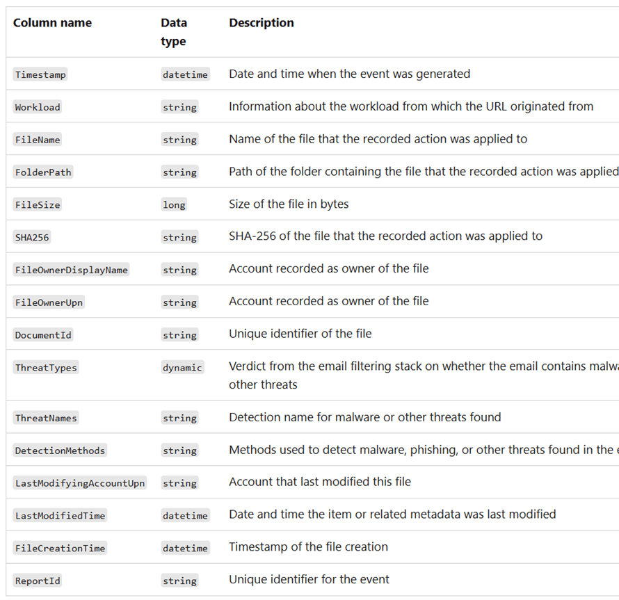 Plus d’informations : FileMaliciousContentInfo table in the advanced hunting schema