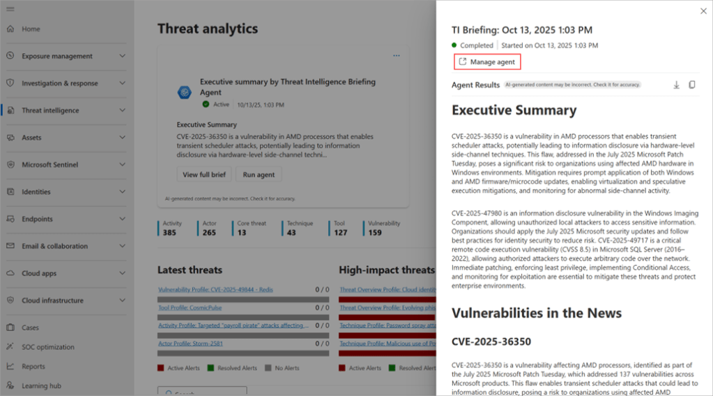 Plus d’informations : Security Copilot Threat Intelligence Briefing Agent in Microsoft Defender